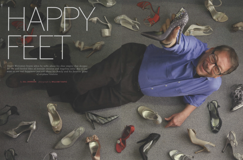 “No, they told me to wear a tie!” he says, like a kid on Sunday morning. They are his people—anyone with an empire the size of Stuart Weitzman’s needs them—and they chuckle as he removes the tie and tosses it aside. The photographer captures several frames of Weitzman’s amiable smile and the shoot wraps. However, Weitzman is not ready to talk shoes until he offers some advice to the lensman, who has revealed that he has teenage daughters.